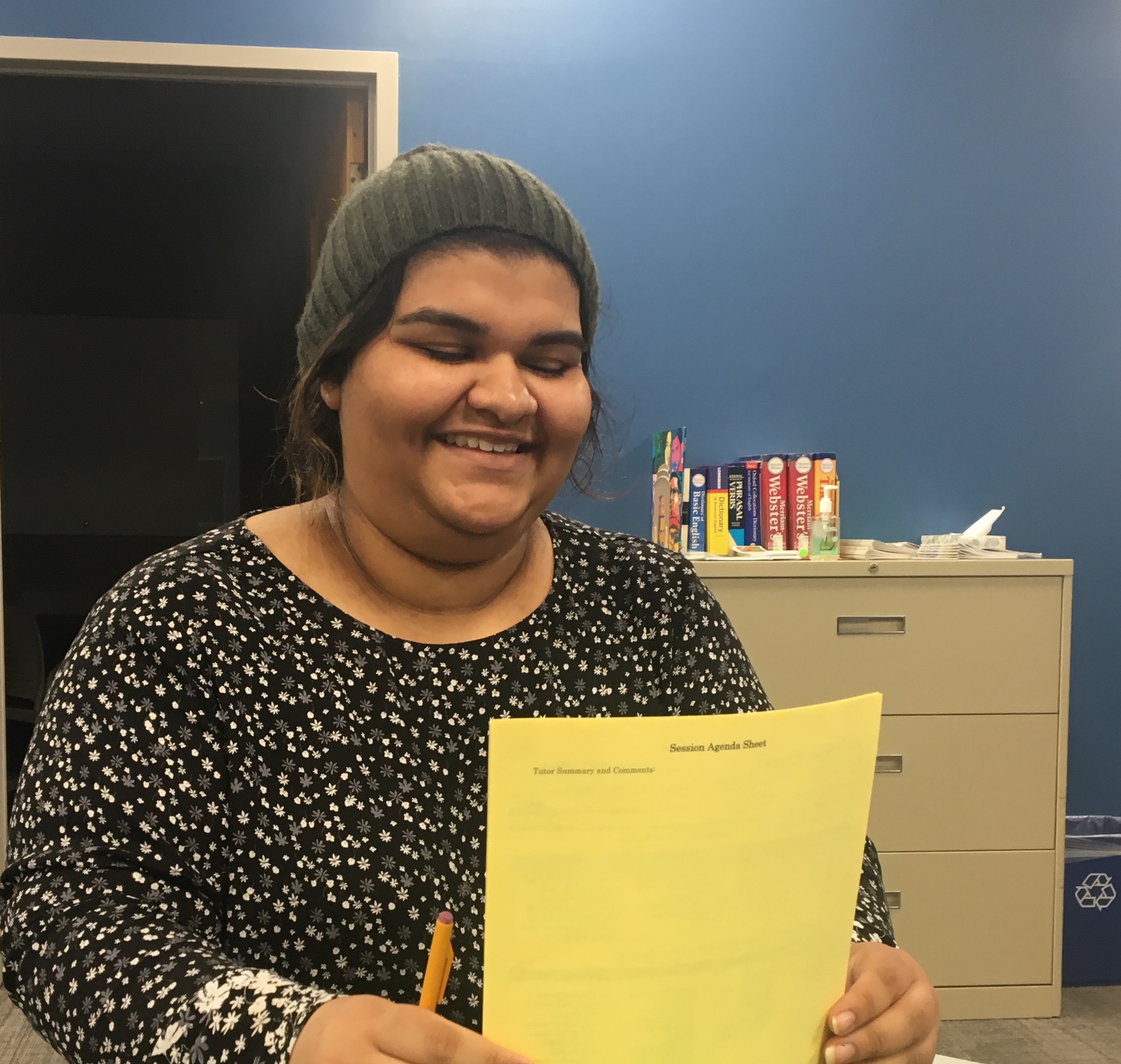 - Favorite thing about working in the writing center so far: When a tutee looks relieved and happy after a session with me. That is the best part to know other people feel I helped them even a little bit.
