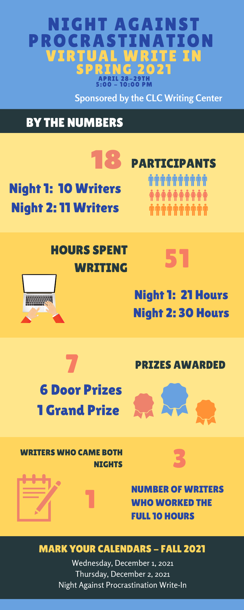 This spring the CLC Writing Center once again held our Night Against Procrastination Write-In event online due to the Covid-19 pandemic. The event spanned two nights, Wednesday, April 28, 2021 and Thursday, April 29, 2021 going from 5:00 pm – 10:00 pm each night.