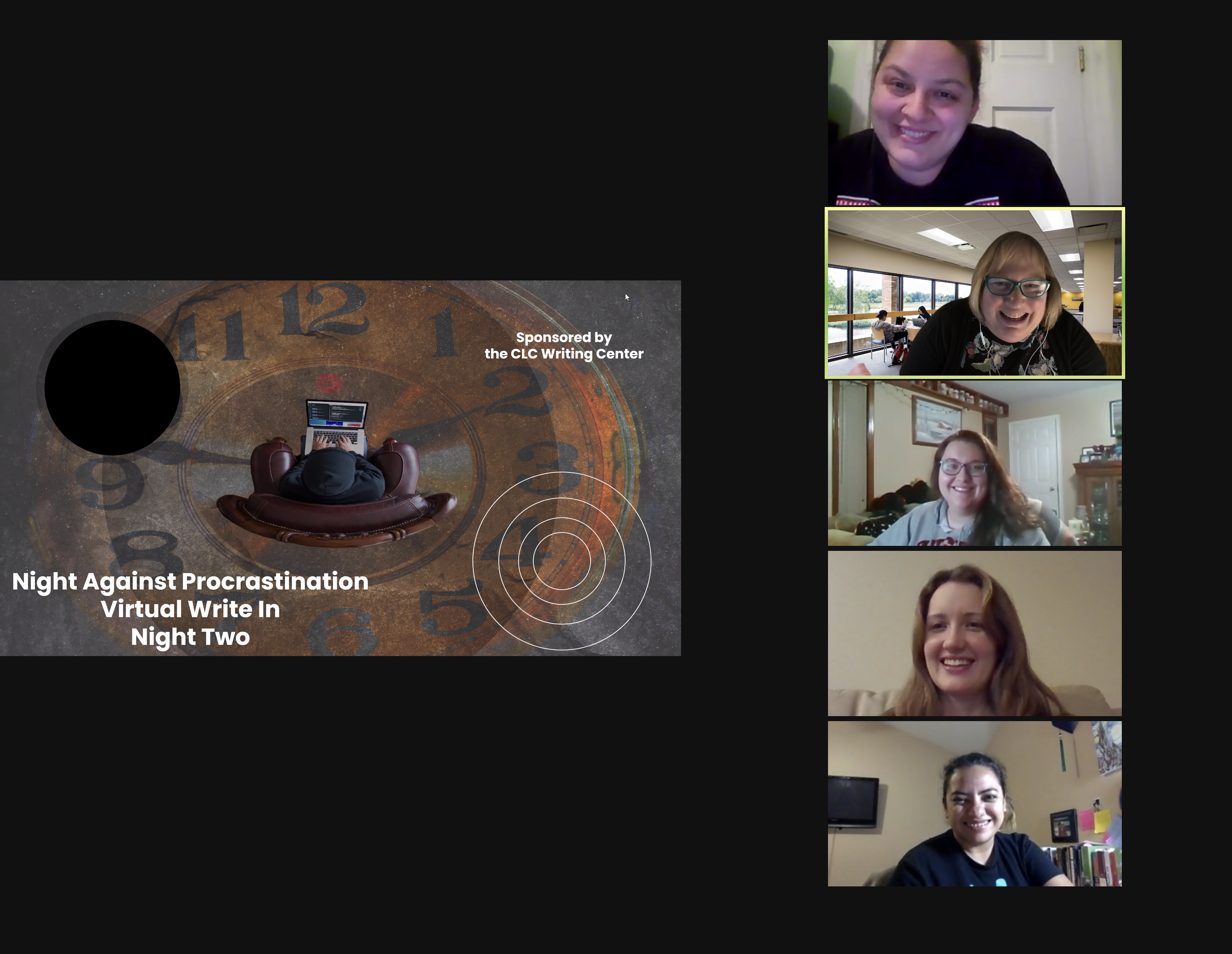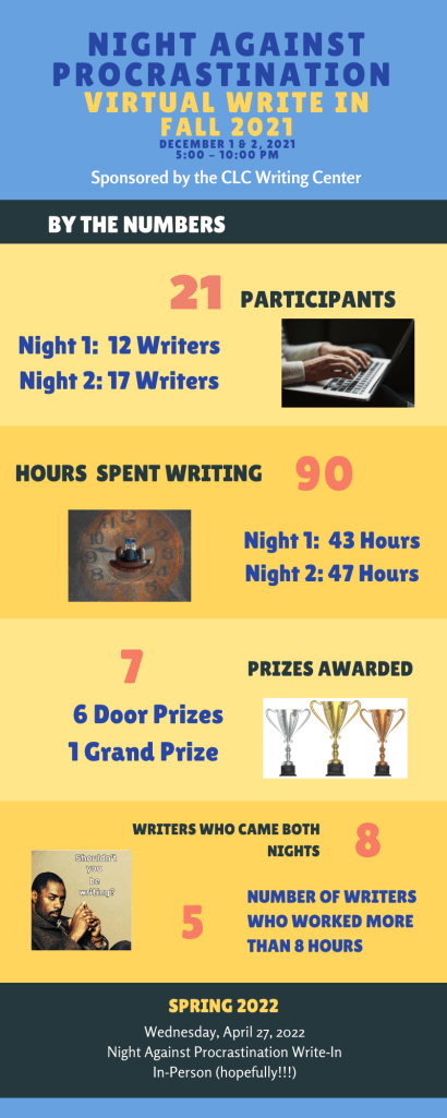 The CLC Writing Center hosted another successful Night Against Procrastination Virtual Write-In. Twenty CLC students and one CLC faculty member worked for over 90 total hours over two nights. For more numbers, see the infographic below: