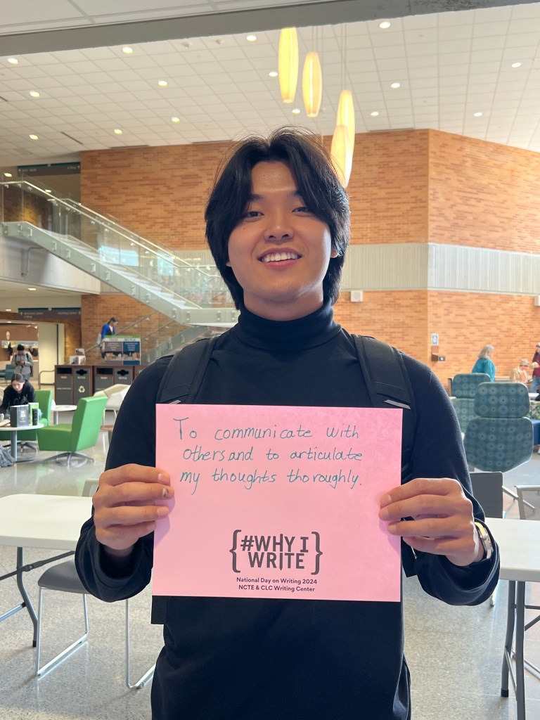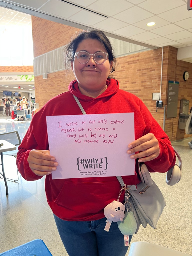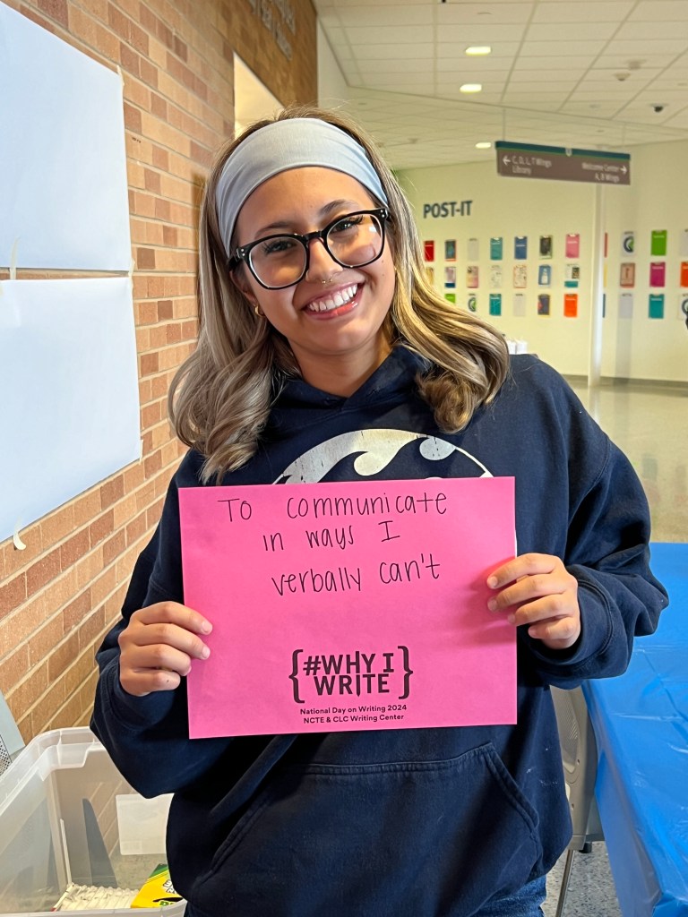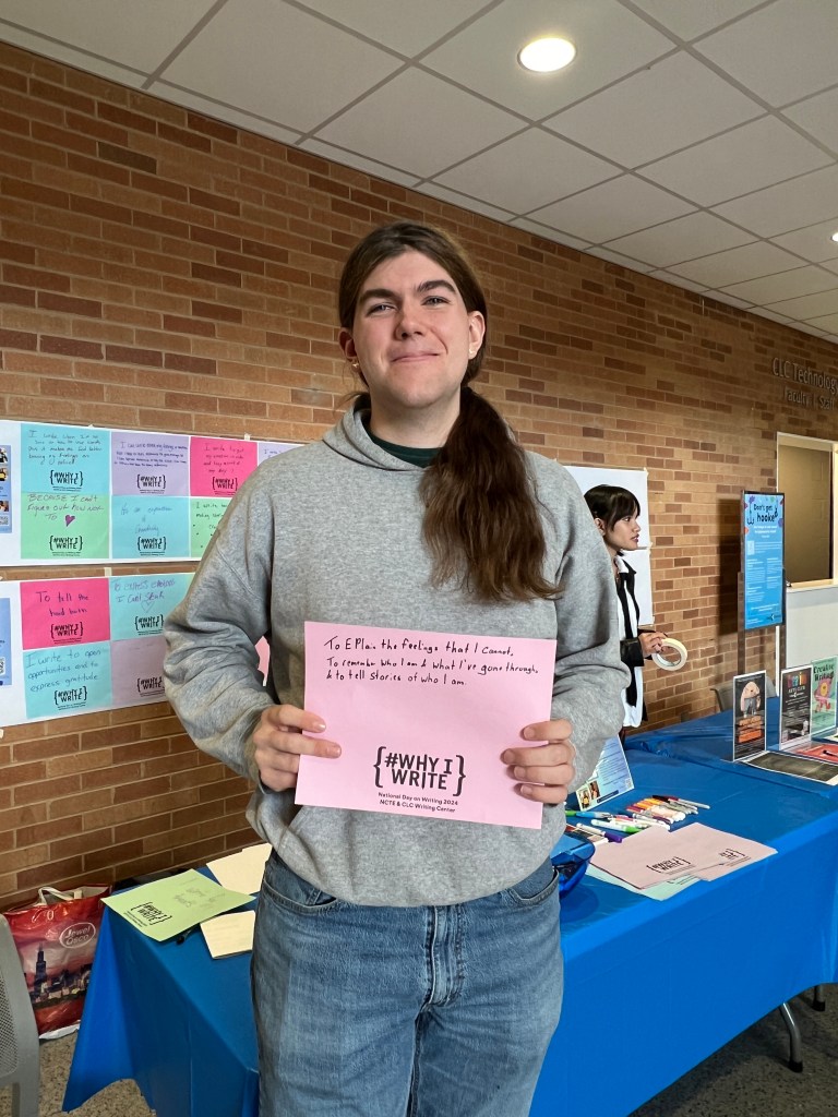Students, staff, and faculty that filled out a #WhyIWrite flier at the tabling event were encouraged to participate in our social media campaign. Participants encouraged to snap a photo or quick video of themselves holding up their #WhyIWrite flier and could either post it to Facebook or Instagram and tag the CLC Writing Center’s pages, or they could share their picture/video with the center staff, and we would post it on our pages. Those who participated were entered into a drawing for a gift card. We’ve been sharing some posts on our Instagram and Facebook pages (feel free to give us a follow and some likes there!)