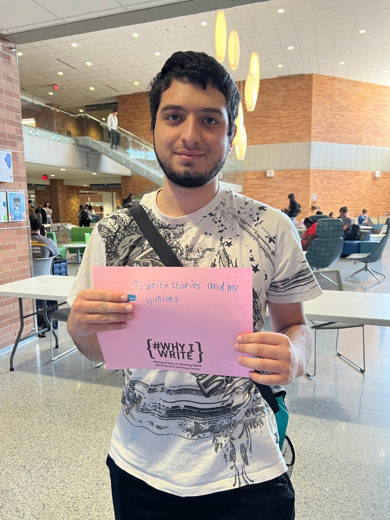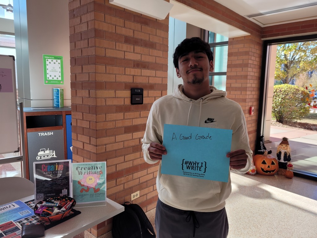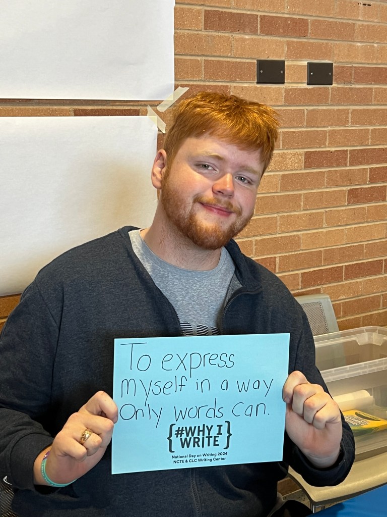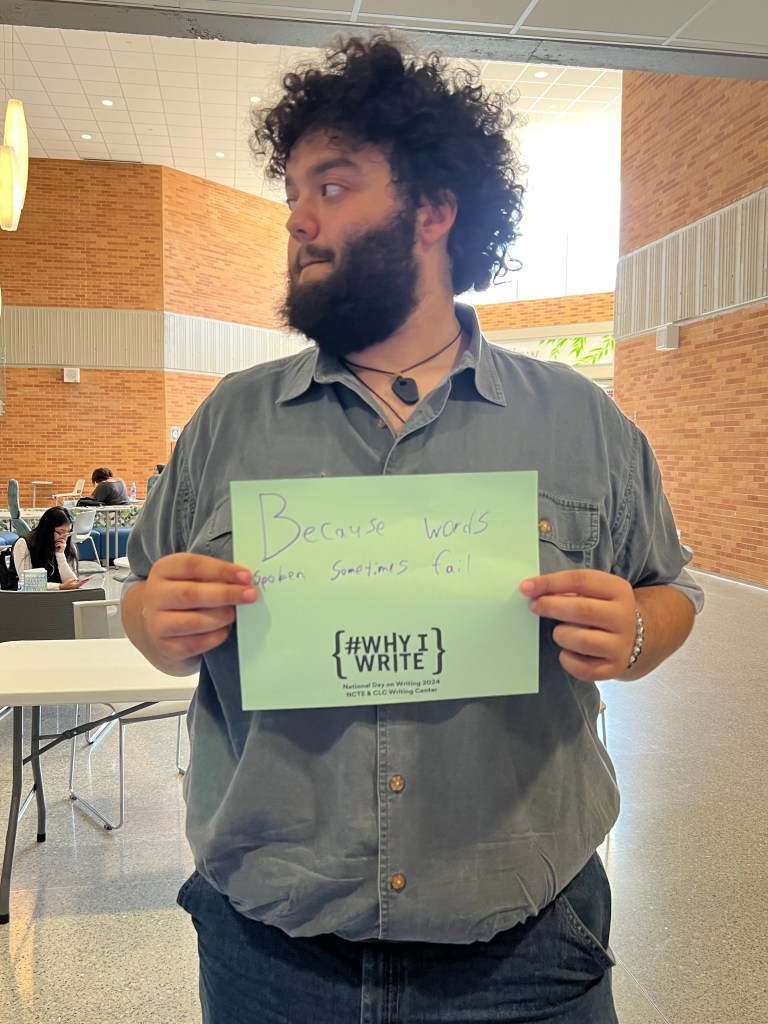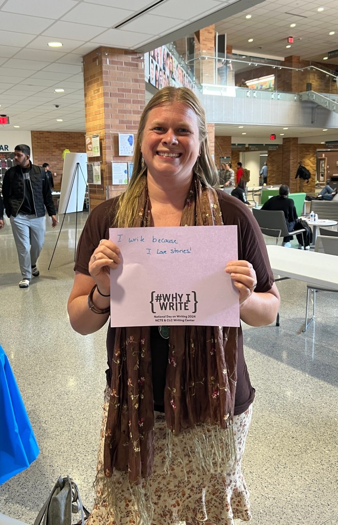 Students, staff, and faculty that filled out a #WhyIWrite flier at the tabling event were encouraged to participate in our social media campaign. Participants encouraged to snap a photo or quick video of themselves holding up their #WhyIWrite flier and could either post it to Facebook or Instagram and tag the CLC Writing Center’s pages, or they could share their picture/video with the center staff, and we would post it on our pages. Those who participated were entered into a drawing for a gift card. We’ve been sharing some posts on our Instagram and Facebook pages (feel free to give us a follow and some likes there!)