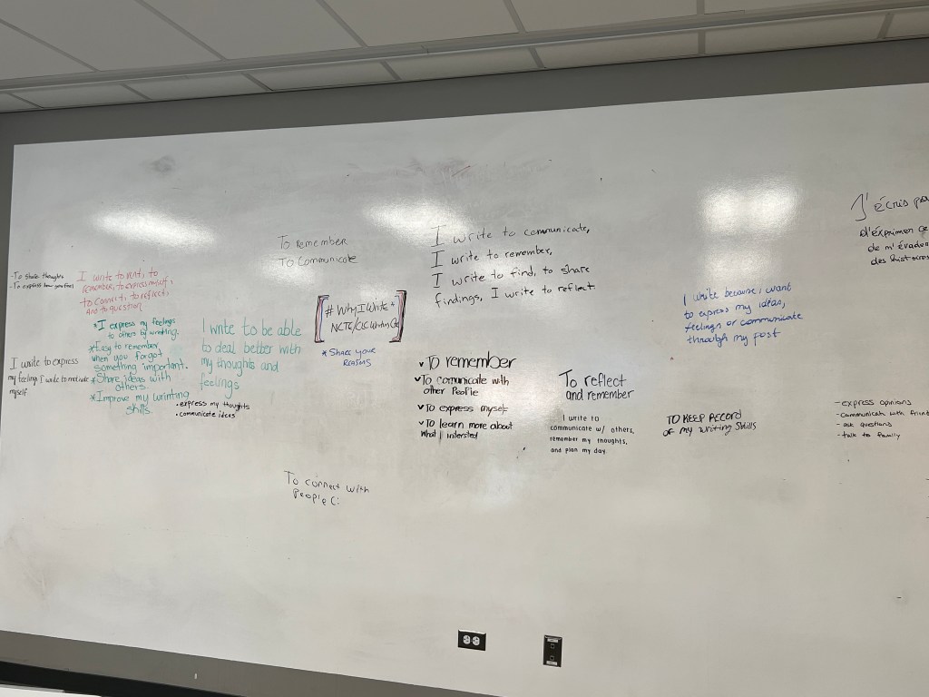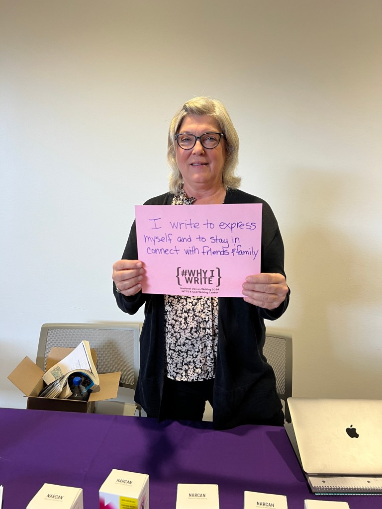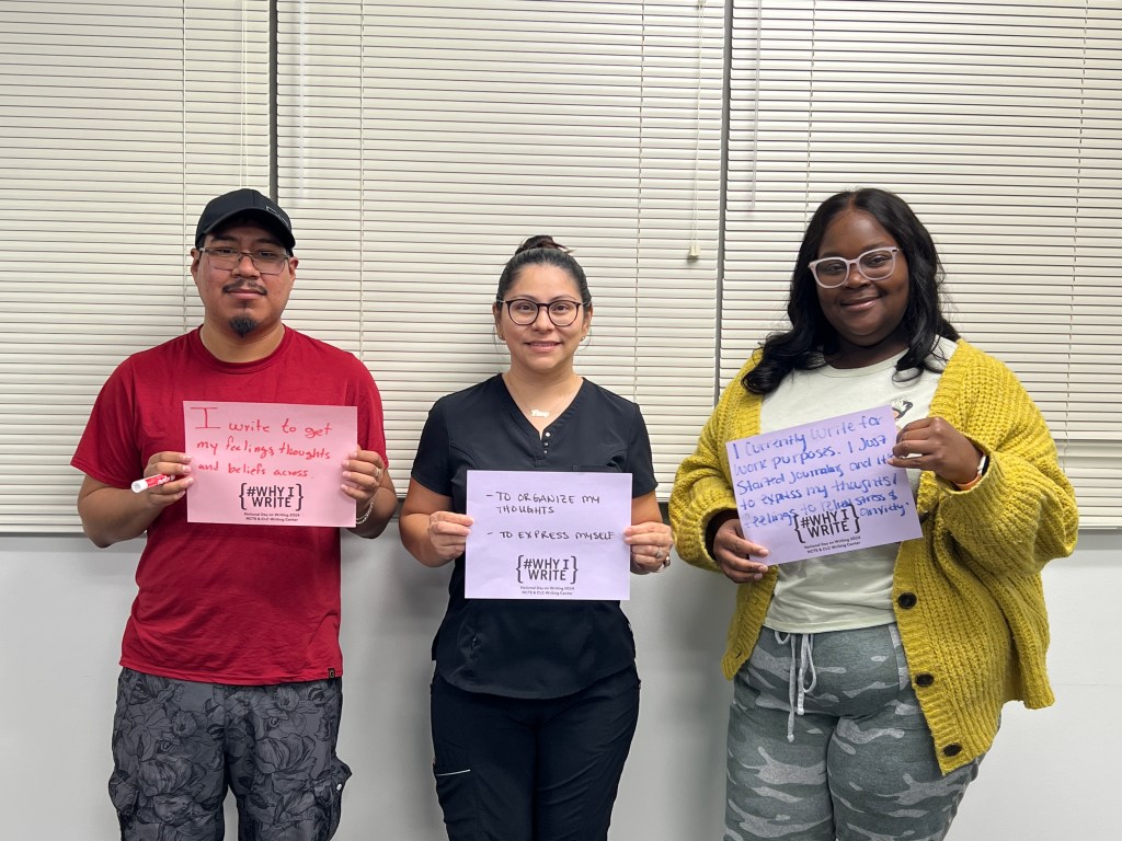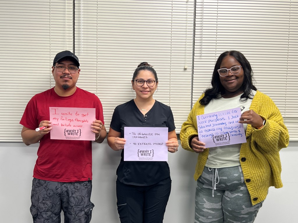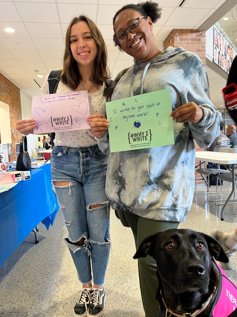 To celebrate, we hosted tabling events at all three campuses on 10/21 where students, staff, and faculty filled out fliers letting us know why they write. You can see some of their responses in the slideshow below. We also shared information about upcoming events at the college and new classes for the Spring 25 semester.