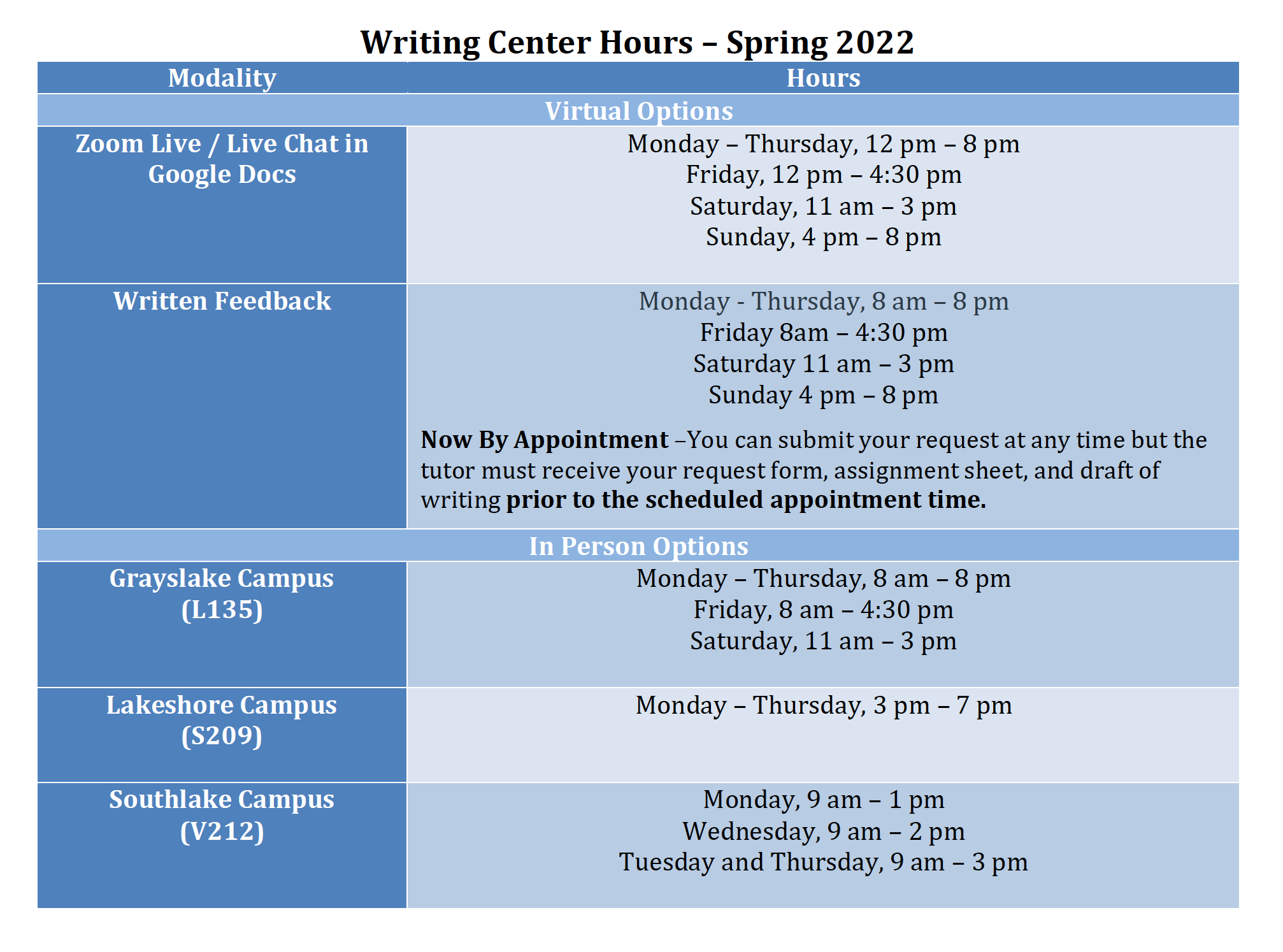 The CLC Writing Center opens for business at 8:00 am on Tuesday, January 19, 2021. We look forward to working with you!